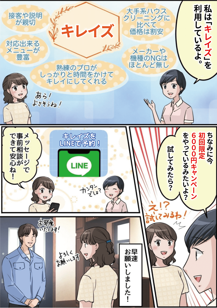 キレイズでは、作業品質・接客対応・アフターサポートでお客様満足に徹底的にこだわり、一度利用して頂ければばまた頼みたいと思って頂ける自信があるため、初回キャンペーンは採算度外視でご対応させていただきます。